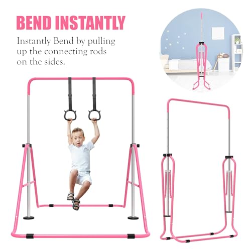 ToughHub Gymnastics Bar for Kids, Adjustable Height Foldable Horizontal Gymnastics Bar with Rings, Safe Home Gym Training Equipment for Strength & Flexibility, for Boys & Girls (Pink)