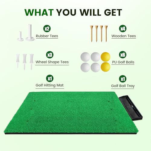 - PERFECT GOLF PRACTICE MAT SET: Package includes 1 x Golf Hitting Mat, 1 x Golf Ball Tray, 2 x Rubber Tees, 3 x Wheel Shape Tees, 4 x Wooden Tees and 6 x PU Golf Balls. Large golf practice mat, comes with great accessories, great for golf practice, perfect gift for golf lovers.