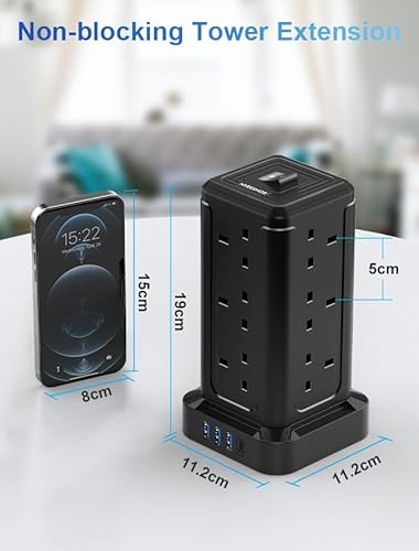 - 【Multiple Protection Plug extension cord tower】-Our extension lead tower advanced multifunctional protection technology to protect your computers, TV ect valuable electronic devices, power strip surge protector providing over-voltage, over-current, short-circuit and high-temperature protection