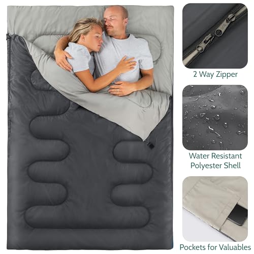 - PERFECT FOR WARM & COOL WEATHER CAMPING: Our double sleeping bag's snug 250gsm hollow fibre filling delivers peak comfort at a temperature of 5°C with a max temperature rating of 15°C for the late spring, summer and early autumn months. An extreme rating of -5°C also allows you to use it during the cooler autumn and winter months.