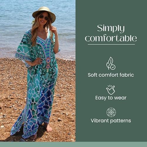 Trillion London Long Sea Green & Blue Kaftan | For Women | Beachwear, Coverup Dress | Suited for Summer | Polyester | Soft & Light Weight Fabric | Holidays Loungewear | Fits UK Size 6 to 14