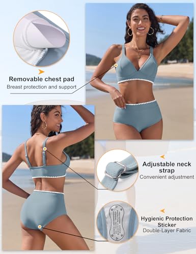 UMIPUBO Women's Bikini Set Two Piece Swimsuit High Waisted V Neck Ladies Swimwear Stitched Bathing Swimming Suit(Grey Blue,L)