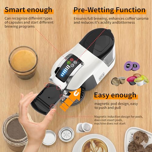 - Multi-Functional Capsule Coffee Machine: Compatible with various capsules and espresso-grade ground coffee, accommodating Nespresso/Dolce Gusto/LAVAZZA A MODO MIO capsules, ground coffee pods, and ESE (44mm) pods. One machine effortlessly fulfils the functions of multiple devices.