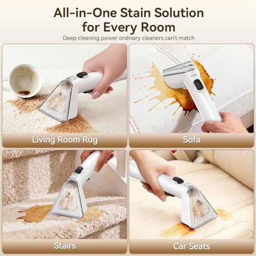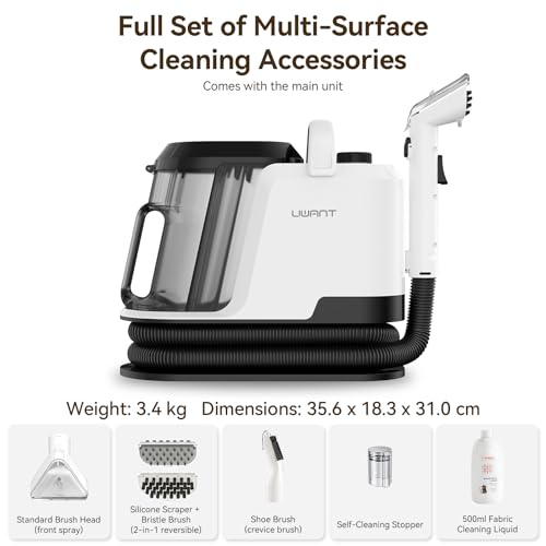 - ✅ COMPLETE & CONVENIENT ALL-IN-ONE SOLUTION: This efficient spot cleaner carpet machine kit includes everything: main unit, 500ml fabric detergent, standard 2-in-1 brush, shoes/crevice tool, and self-cleaning cap. It’s the ideal handheld carpet shampooer and spot carpet cleaner for carpets, upholstery, and auto interiors.