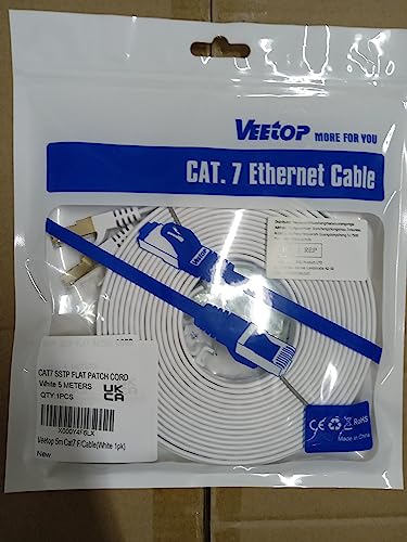 Veetop 5m/16.4ft Flat Cat7 Ethernet Cables High Speed 10Gbps RJ45 Network Ethernet Cable with STP Copper Wires Shielded & Gold Plated Connector for Router Modem Switch(White)