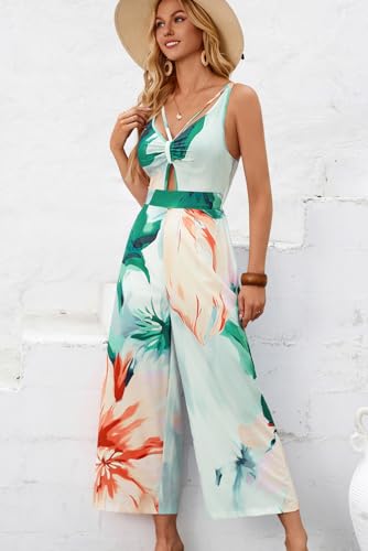 - Crafted with a stunning tropical floral print, this jumpsuit will elevate your wardrobe instantly. The deep V neck and keyhole design add a touch of allure, while the wide leg pants offer comfort and style.