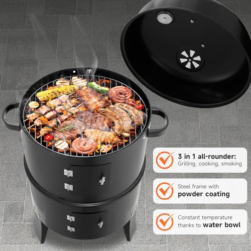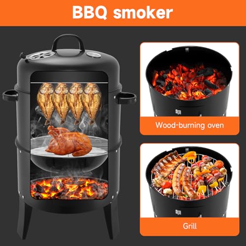 - 【Portable Design】: Three-tier design doubles as a fire pit. Easily switch between grilling and smoking depending on your preference. Equipped with an adjustable vertical barrel grill and two charcoal racks, it allows for seamless cooking. Double doors allow you to quickly check your food's progress and refill the charcoal as needed. A latching locking system ensures maximum stability, while the triangular raised legs further enhance its sturdiness, ensuring safe enjoyable cooking experience.