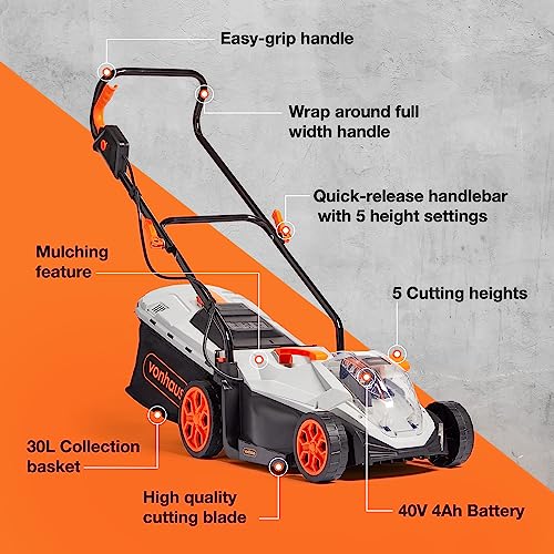 VonHaus Cordless Lawnmower 40V – Electric Lawn Mower – 30L Collection Box, 5 Cutting Heights, 33cm Cutting Width, 5 Height Settings, Mulching Feature, Foldable Body, 4Ah Battery & Charger Included