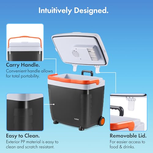 - HANDLES & WHEELS: The handle doubles up as a lid holder and lock, propping the electric cooler box open or securing it shut on the go. Or, use the extendable handle to wheel around.