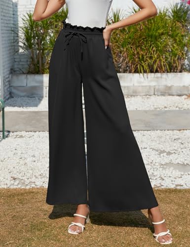 Voqeen Womens Wide Leg Trousers Summer Culottes Elastic High Waist Flowy Palazzo Trousers Loose Flared Pants Casual Baggy Trousers with Drawstring Pockets Lightweight Work Bottoms for Ladies Black