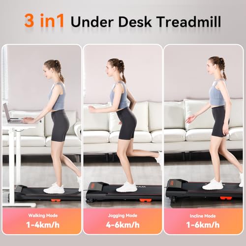 - 【3 in 1 Design Walking Pad】The 3-in-1 walking pad treadmill has a speed rang of 1.0-6.0KM/H and can not only for walking running, but also for use under the desk. Meet the various exercise needs of the home and office.