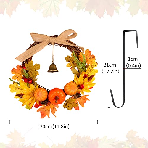 - LOVELY APPEARANCE – The outdoor autumn door wreath decoration made of simulated rattan, artificial maple leaves, pumpkins, berries, acorn and decorated with a ring bell and a bow to make the autumn garland more lovely and elegant.
