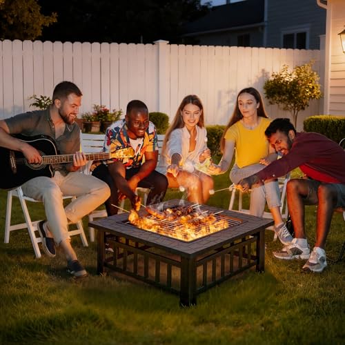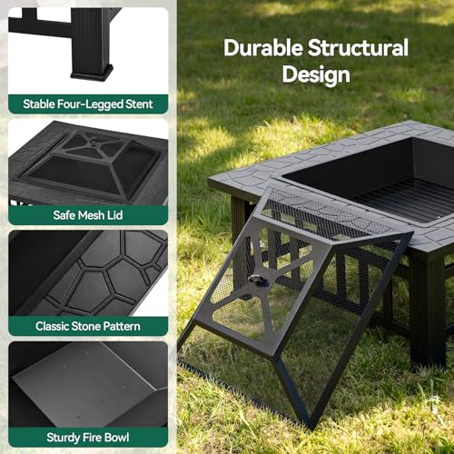 Warmiehomy Fire Pit For Garden, Outdoor Fire Pit Metal Wood Burning Square Firepits with Spark Protector Screen, Grate, Poker, Camping Firepit Table For Barbecue, Heating, Cooling (81L*81W*36H CM)