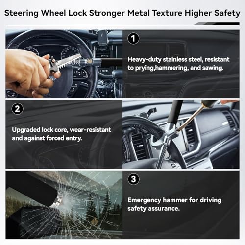 - 【Multiple Uses】At the same time, it is a safety escape tool. Anti-theft steering wheel lock has a safety hammer function at the rear, when an emergency occurs, you can quickly and use the safety hammer to break the window, so that you have a chance to escape from danger. It ensures the safety of the user in any potentially dangerous moment.