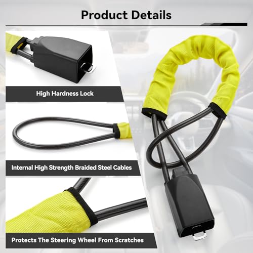 - 【Premium Material】This steering wheel is made of high performance braided steel wire rope inside and soft PVC outside, which has excellent resistance to cuts and saws. The steering wheel lock is compact and lightweight, and can be easily rolled up and placed anywhere in the car.