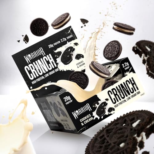 Warrior Crunch Protein Bars, Cookies and Cream 12 x 64g – High Protein Snacks (20g), Low Sugar, Low Calorie Snack Bar, Guilt-Free On-the-Go Treats, Multipack Diet Bars for Weight Loss