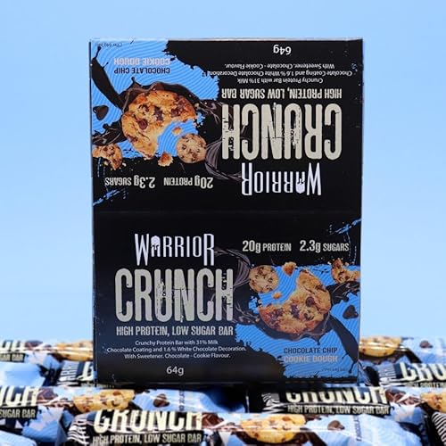 Warrior Crunch Protein Bars – 20g Protein Per Bar – Low Carb, Low Sugar Snack – High Protein Treat – Chocolate Chip Cookie Dough Flavor – 12 x 64g Bars – Ideal for Fitness, Muscle Recovery
