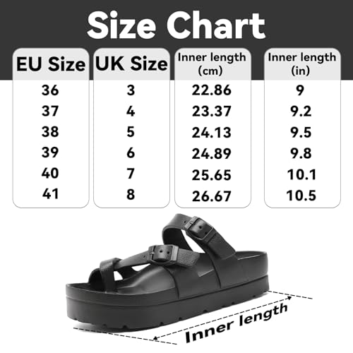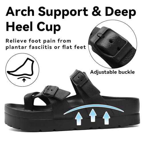 Waysoland Women's Platform Sandals with Arch Support Comfortable Slides Thick Soles Flat Sandals With Adjustable Buckle & Ultra Cushion(Black,6 UK)