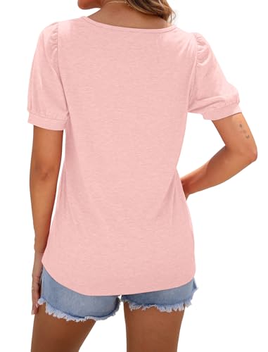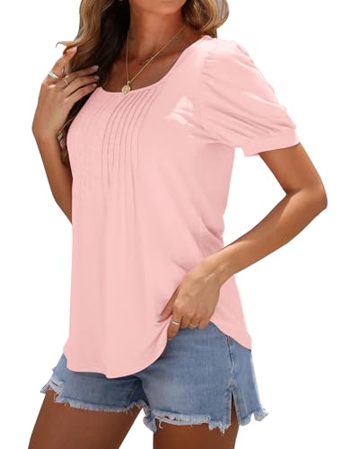 WNEEDU Ladies Tops Square Neck T Shirts for Women UK Summer Puff Short Sleeve Blouses Pleated Tunic Tshirts Flowy Elegant Casual Tee Light Pink XL
