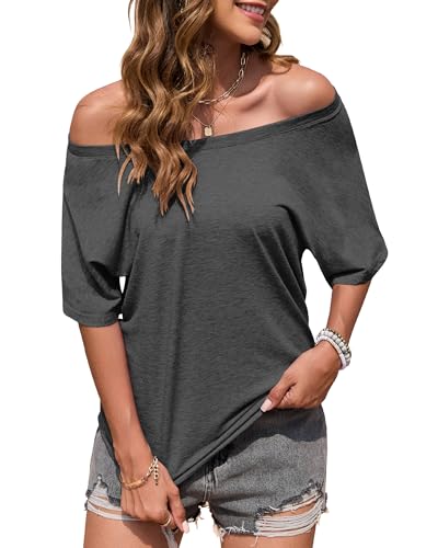 WNEEDU Womens T Shirts Summer Baggy Off Shoulder Tops Ladies Batwing Short Sleeve Tops Crew Neck Casual Tshirt Grey L
