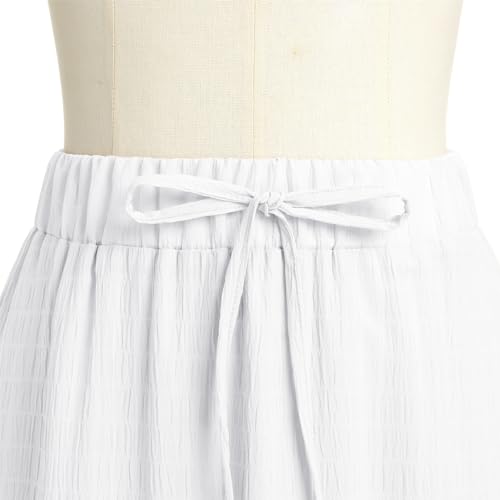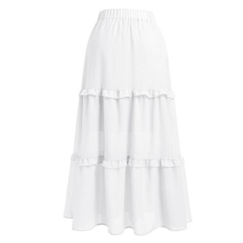 Women Boho Summer Skirt A Line Elastic High Waist Tiered Pleated Skirts Casual Flowy Swing Beach Skirts Solid Color Ruffle Maxi Long Dress for Holiday White S