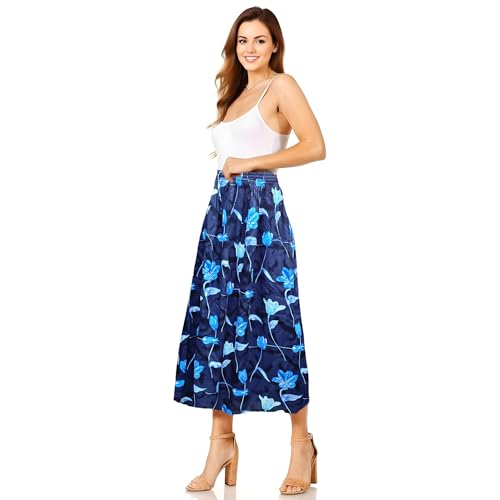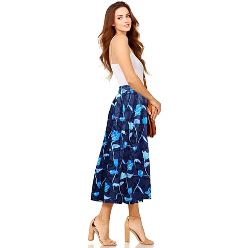 Women Floral Print Skirt Soft Lightweight Elasticated Waist (M, L, BLU Leaf)