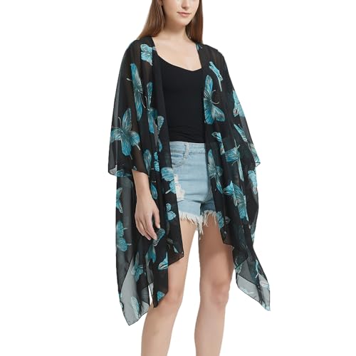 Women's Bohemian Floral Chiffon Beach Cover up Swimsuit Kimono Summer Swimwear Cardigans, Black With Blue Butterflies, One Size
