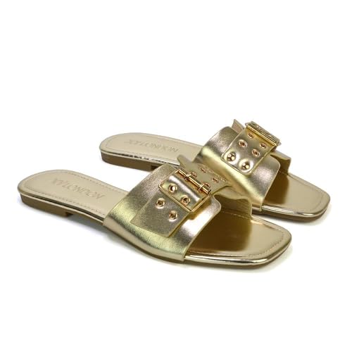 Womens Flat Slide Sandal Ladies Slip On Summer Casual Flip Flop Gold Synthetic Leather Summer Mule Size 7