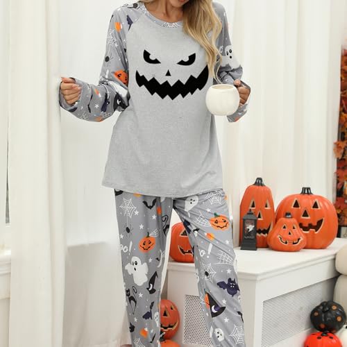 Women's Halloween Pajamas Set Ghost Pumpkin Print Long Sleeve Round Neck Tops with Elastic Waist Long Pants Loungewear (A-Gray, L)