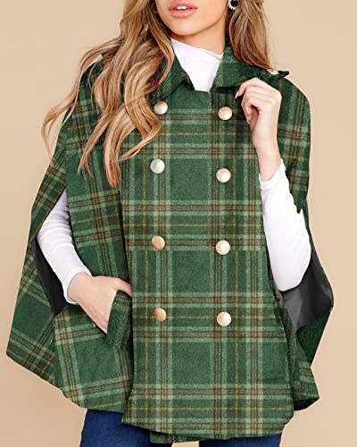 Womens Plaid Jacket Double Breasted Winter Cape Coats Turn Down Poncho with Pockets, Green, M