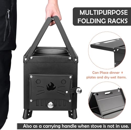 - Easy to Use:The tent stoves wood burning is easy to use and carry because chimney and other parts can be stored in the stove,hasing foldable legs at the bottom .It is easy to clean with stove hook.