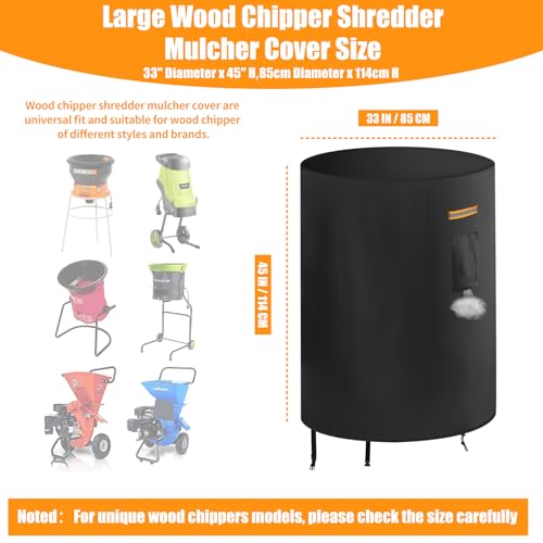 - Universal Fit:SIZE:33 inch Diameter x 45inch H.Our wood splitting machine dust cover is universal fit and suitable for most Bladeless Electric Leaf Mulchers.We recommend that you measure the size of your wood chopping machine from outside edge-to-edge (not the chipper size) before buy.