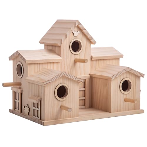 Wooden Birdhouse with Multiple Entry Holes, Natural Pine, Decorative Garden House