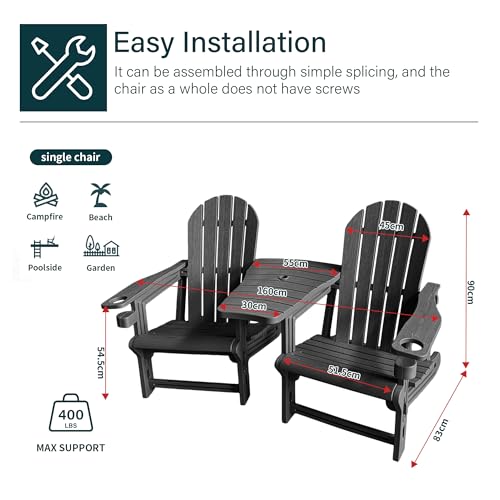 Yaangagpe Double HDPE Adirondack Chair with Table – 2 Seater Garden Furniture Set, Weather-Resistant Outdoor Loveseat (Black)