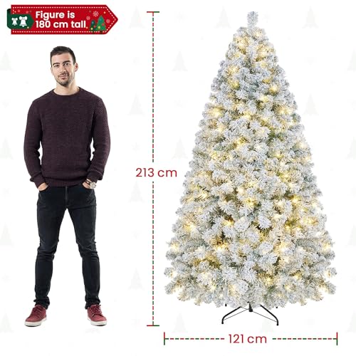 Yaheetech 7ft Pre-lit Flocked Artificial Christmas Tree with 350 Warm White LED Lights, 1000 Tips & Foldable Stand, Holiday Decorative Tree, 8 Lighting Modes, 213 cm, Green & White