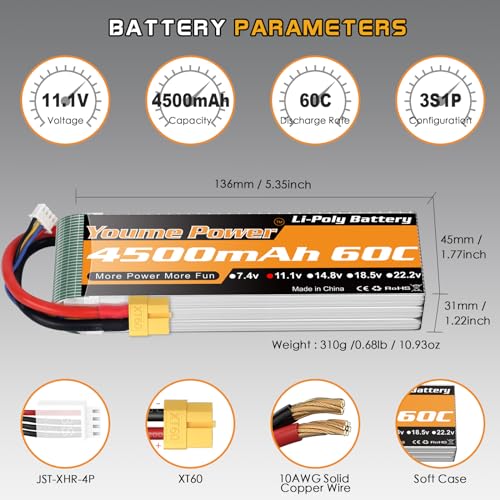 - 【WHAT DO YOU GET】Youme 3s Lipo RC Battery 11.1V 4500mAh 60C,High-Quality raw materials,huge Capacity,high burst,quickly rechargeable and Long cycle life,(150 times minimum),Up to 263Wh/kg energy density