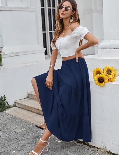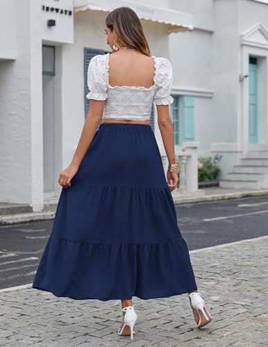 Zeagoo Maxi Skirts for Women Casual High Waist Skirt A-Line Long Skirts Summer Elastic Skirt with Pockets Navy Blue M