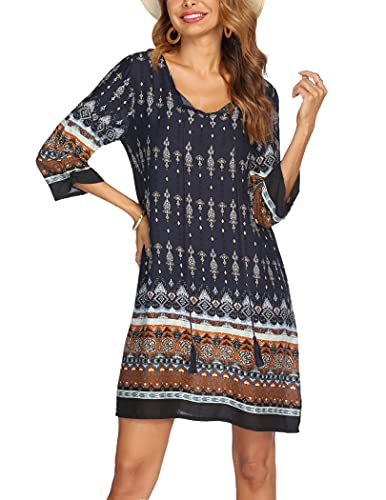 Zeagoo Women's Summer Boho Dresses 3/4 Sleeve V-Neck Floral Casual Ladies Beach Dress Navy Blue XXL