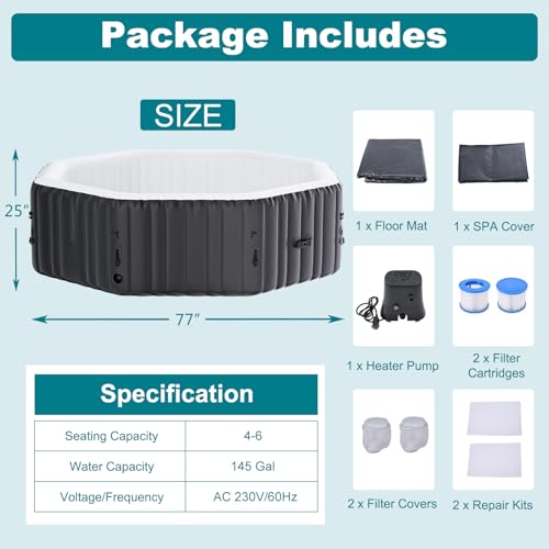 - 【Efficient Heat & Keep Temp with Cover】Hot Tub Built-in 1800W heater + 600W massage head can warm the water from 68℉ to 104℉ for a relaxing soak. Included thermal cover helps retain heat when not in use and its black color gathers heat from the sun for energy-saving. For better heat retention, it is recommended to place a sponge mat (not included) at the bottom.